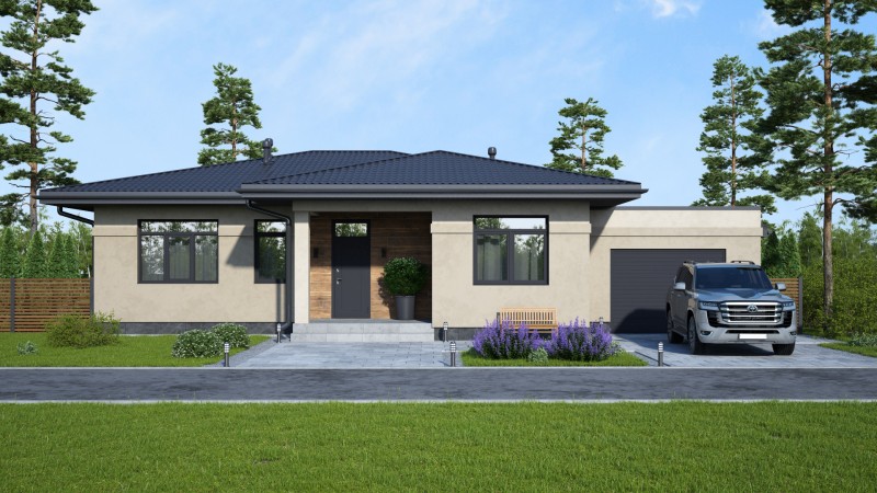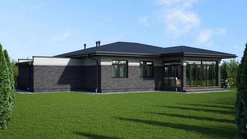Красивый большой одноэтажный дом с оригинальными комбинированными фасадами, интересной кровлей и гаражом. Имеет три спальни, одна из них мастер спальня с гардеробной и санузлом, просторную кухню гостиную с выходом на террасу, котельную-постирочную, второй санузел, закрытое от осадков крыльцо и просторную террасу, гараж на один авто.