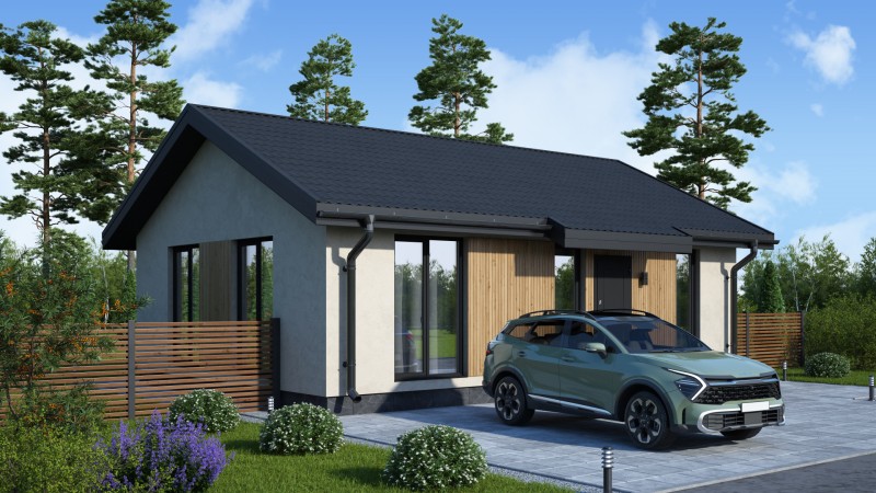 Компактный функциональный одноэтажный дом с оригинальным фасадом и двухскатной кровлей. Имеет две спальни, кухню гостиную с выходом на задний двор, котельную-постирочную, второй санузел можно разместить в котельной постирочной.