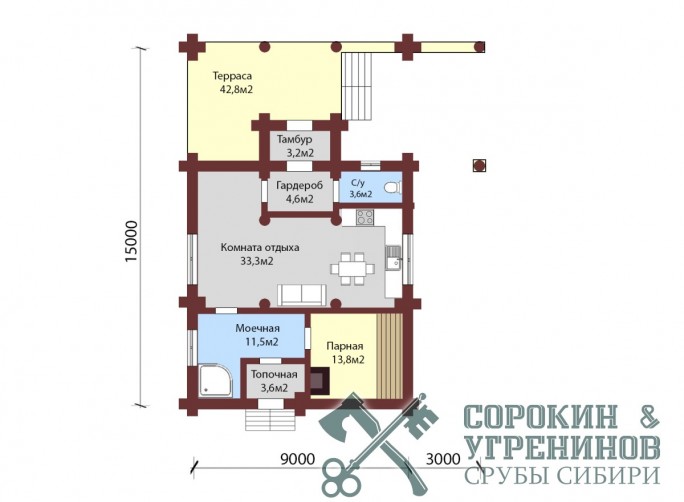 Эксклюзивный банный комплекс, сруб бани рубленый из бревна кедра большого диаметра 450мм, общей площадью 182,6м2. Размер сруба 9х15 метров по осям. Баня с мансардной крышей, и с антресолью. Просторная парная, помывочная, санузел, тамбур, гардеробная, комната отдыха и большая веранда, топочная с отдельным входом. зона барбекю. Баня проектировалась для базы отдыха санаторного типа, кровля на данном проекте была реализована живая, земляная с травой.